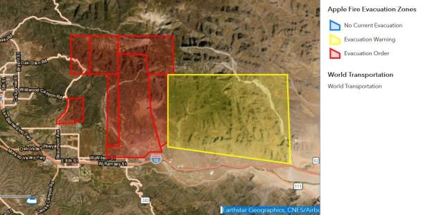 Smoke Advisory: Smoke from the Apple Fire has impacted communities to the east. Unhealthful air quality can result in the exacerbation of some medical issues, especially lung problems. Residents with medical issues affected by smoke are encouraged to stay indoors and avoid strenuous activity in smoky conditions.