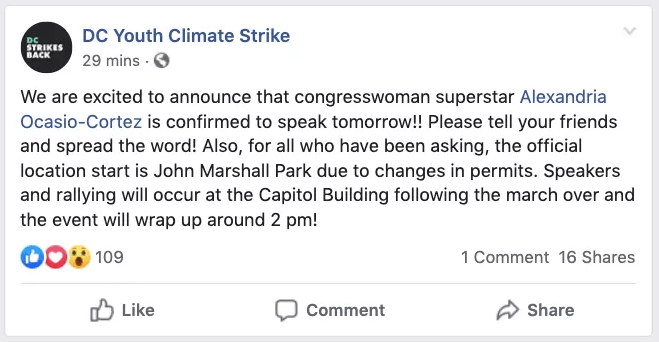 11:00am: Start at John Marshall Park (Pennsylvania Ave NW in Penn Quarter). The march will then proceed to Capital Hill where NY Rep Alexandria Ocasio-Cortez will speak.