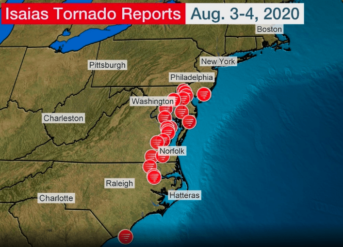Isaias is sustaining 65 mph winds and moving NNE at 40 mph. Widespread sustained tropical storm force winds expected along mid-Atlantic coast and will spread across New England tonight. Numerous tornadoes have already occurred over portions of the mid-Atlantic and the threat continues into New England this afternoon.