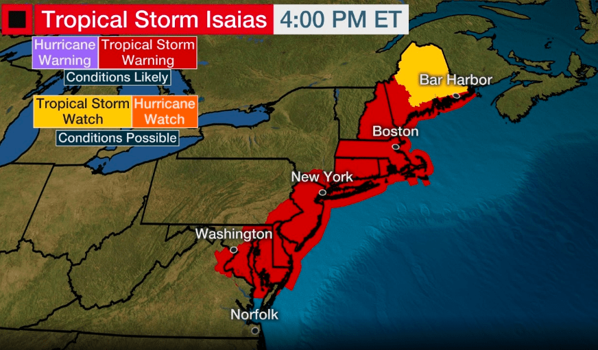 4 PM EDT August 4 Update: Tropical storm conditions being felt across parts of southeastern New England. For detailed local weather info visit https://t.co/SiZo8ozBbn #Isaias pic.twitter.com/rL78FjVAyz