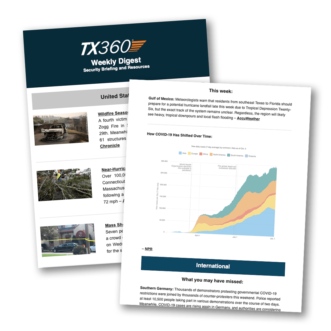 TX360 helps our clients navigate the COVID-19 crisis by providing comprehensive alerting and 24/7 dashboards tracking COVID-19 around the world. An analyst-curated COVID-19 brief expertly curates the major updates every day to keep you informed. Sign up today for a free demo of TX360.