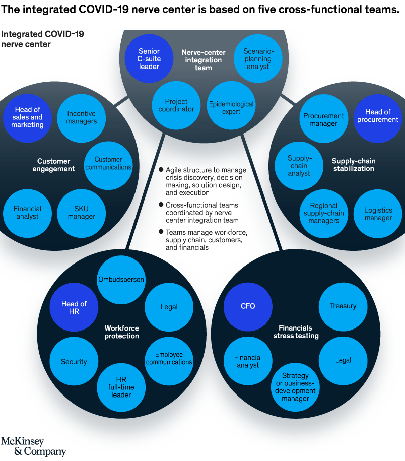 Put together the corporate never center described in the recent McKenzie article Decision Making in Uncertain Times. Unify your efforts. Have a 24/7 schedule with rotating resources. Get strategic direction from the C-Suite and set up a recurring briefing with the board of director. Share all relevant issues and information with the cross-company effort.