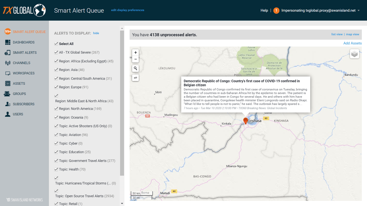 Alerts are also available through the TX Global web portal. In the Smart Alert Queue, alerts are sorted in reverse chronology and can be viewed by map or list view and further filtered by region and topic.