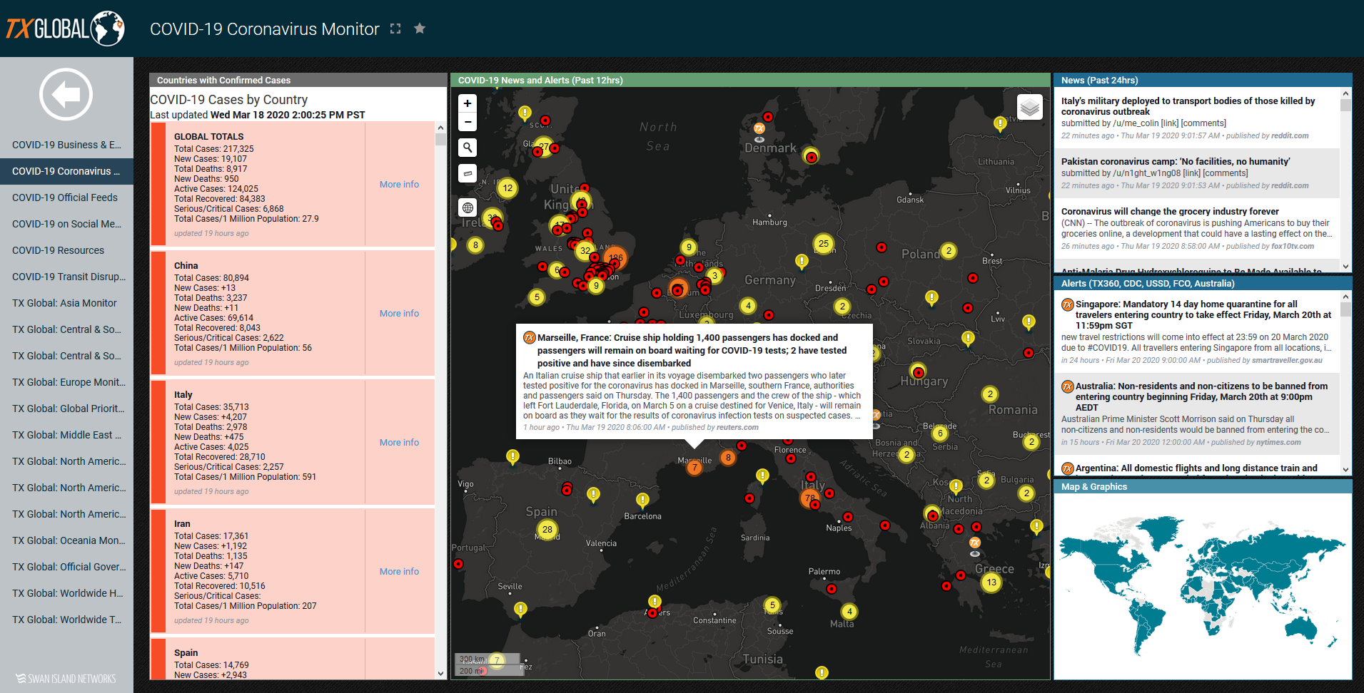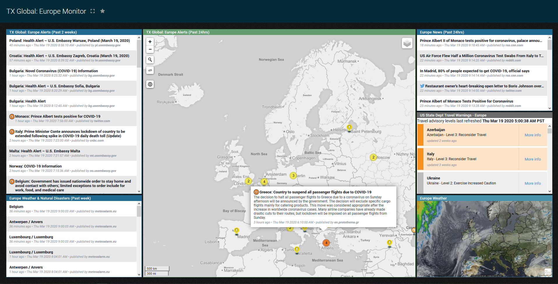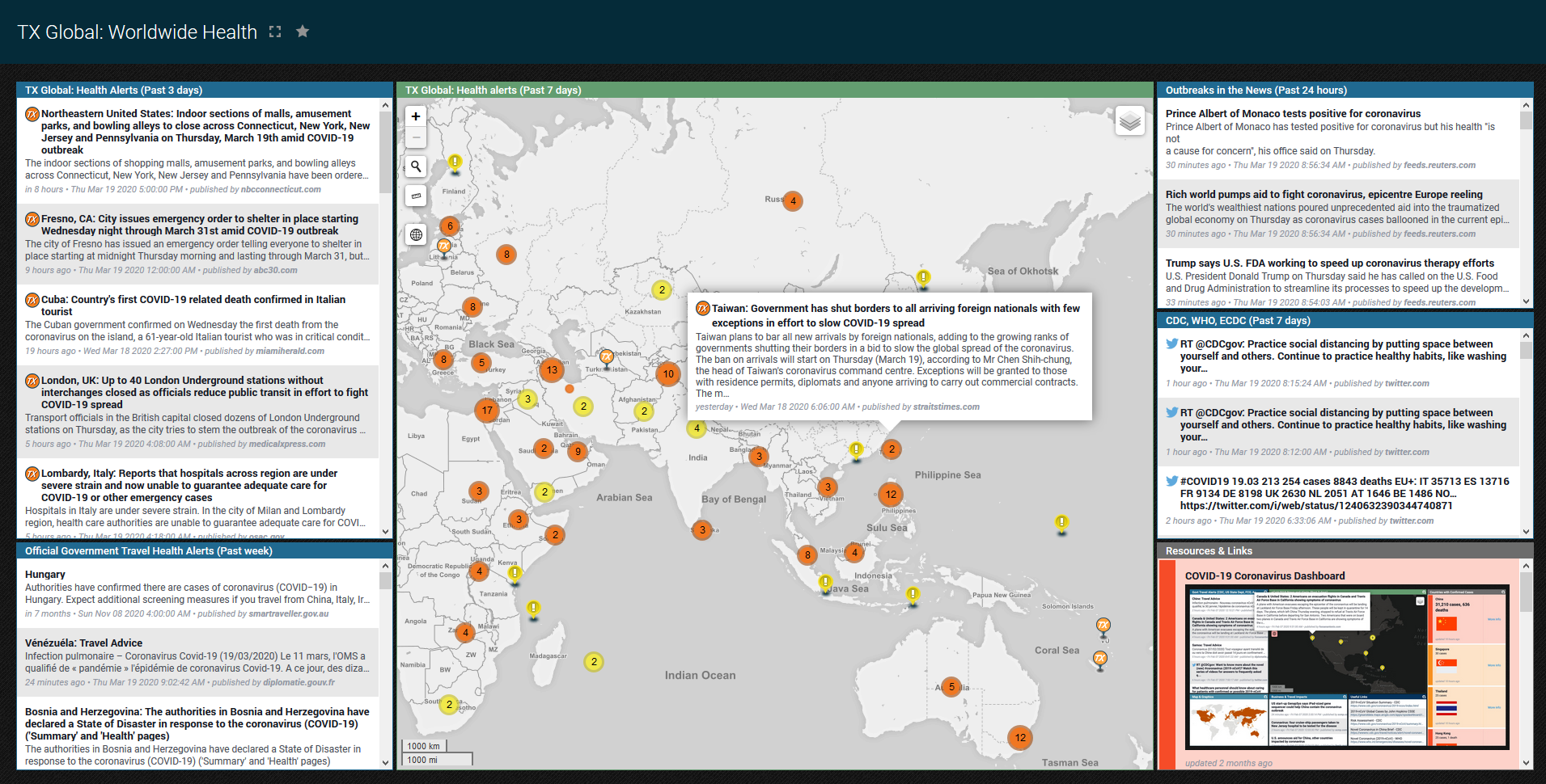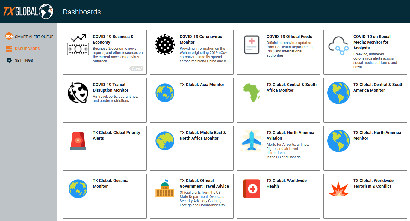 Every TX Global subscriber has access to a comprehensive, curated collection of COVID-19/Coronavirus information on our crisis  monitoring dashboards.